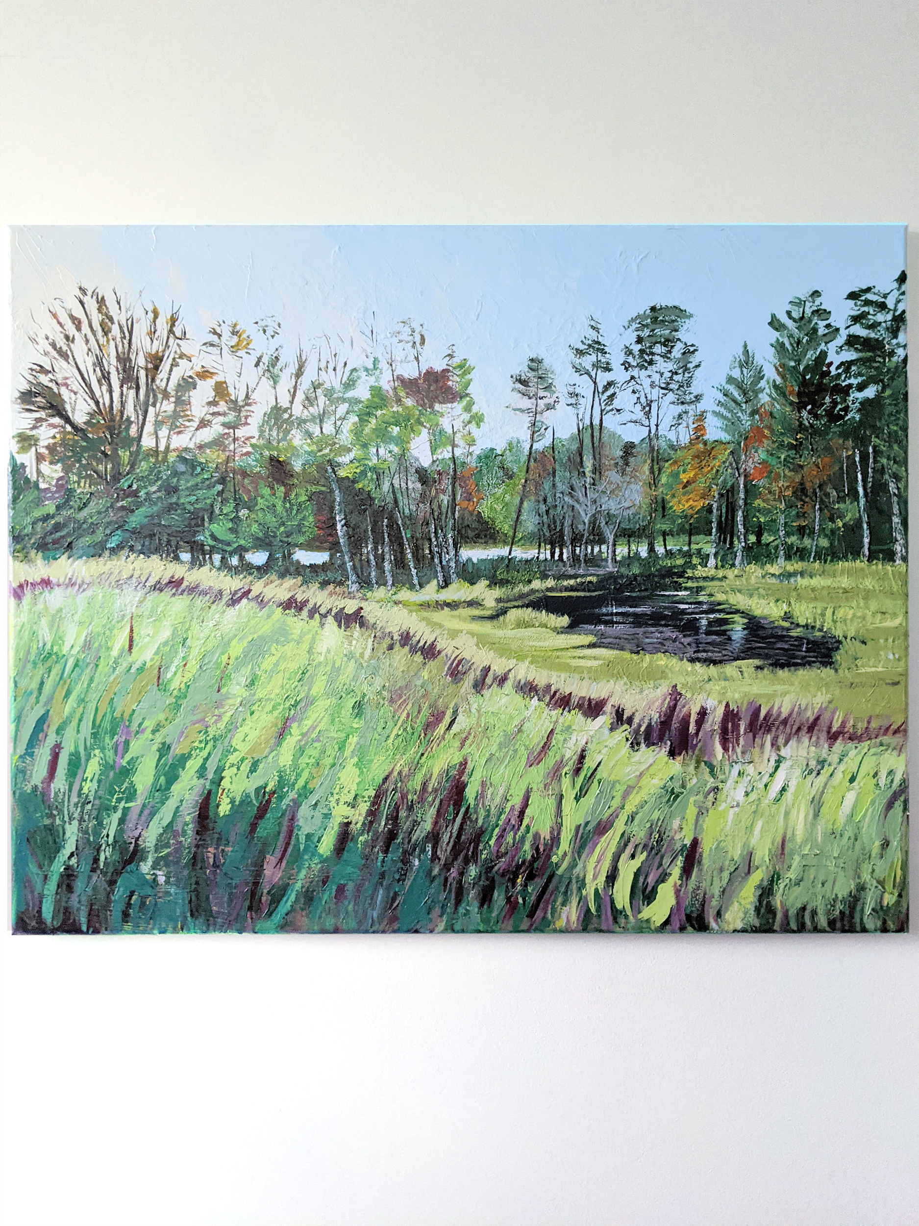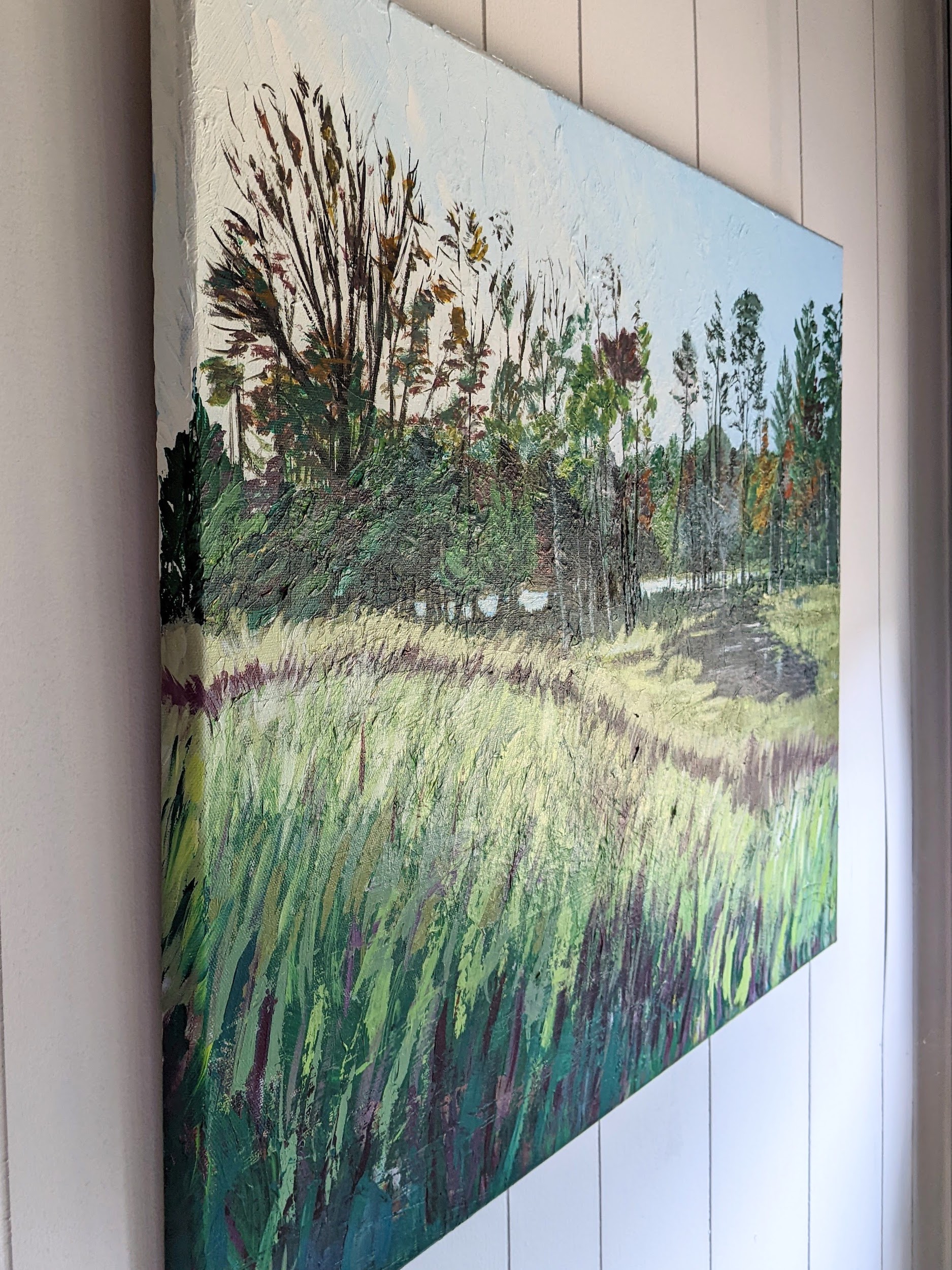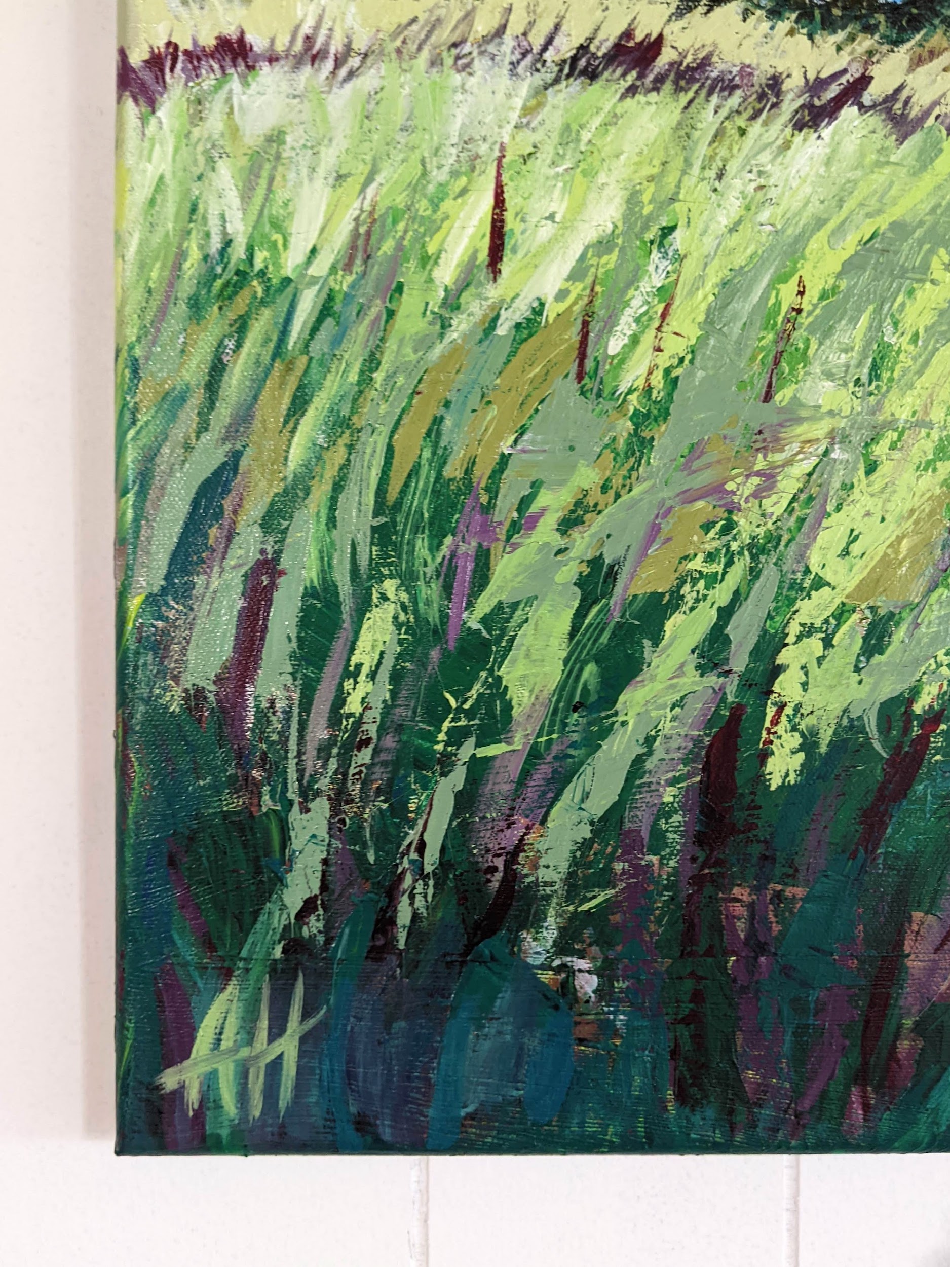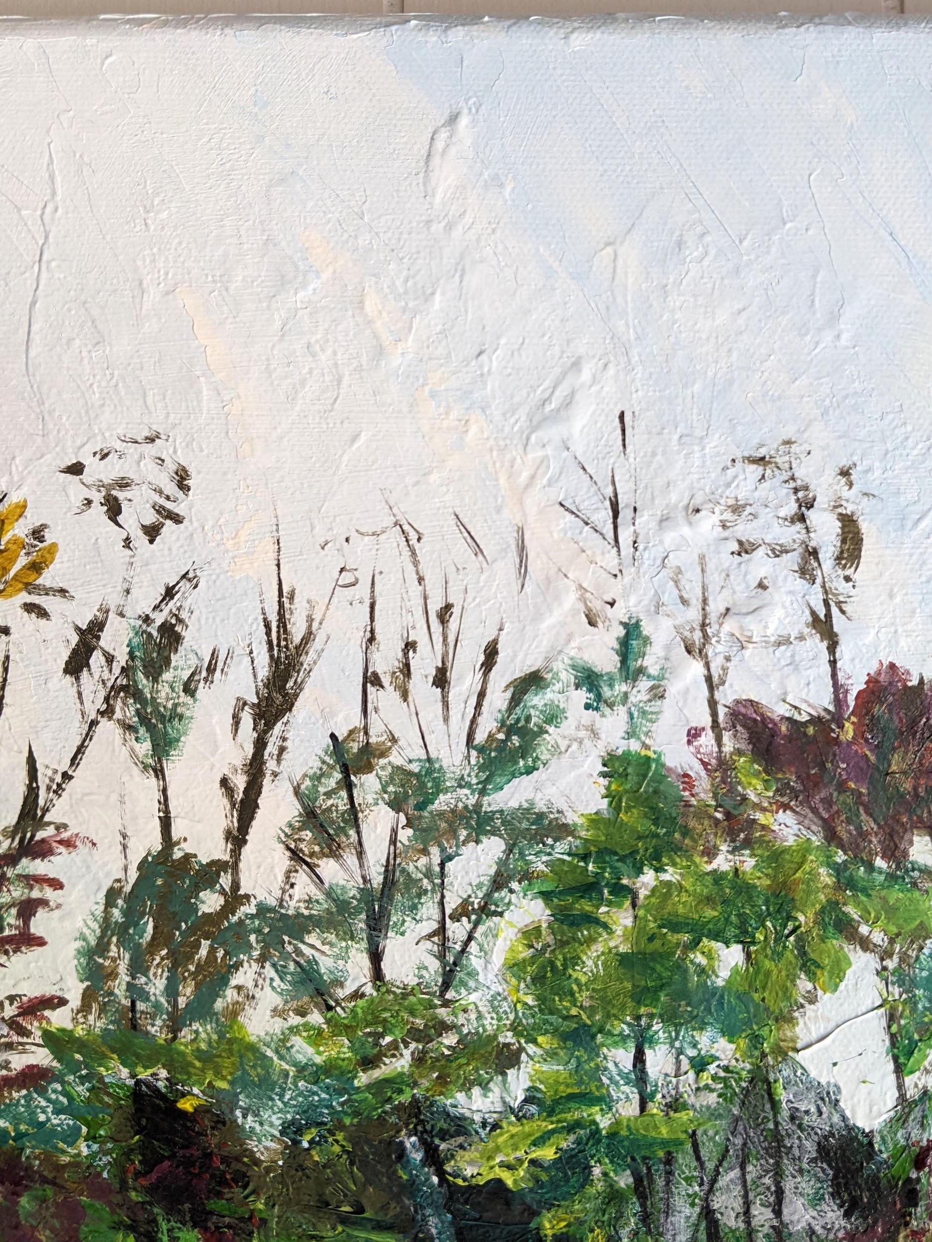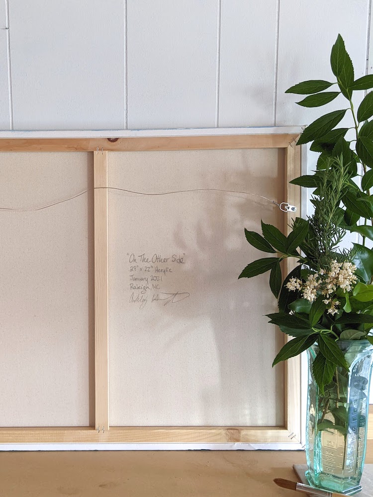 On the Other Side is an original 28×22 acrylic painting on gallery-wrapped canvas. Inspired by the little surprises in life of seeing what’s around the corner and beyond. Looking further than the immediate surrounding gives a better understanding of the landscape and can internalize the importance of different perspectives.