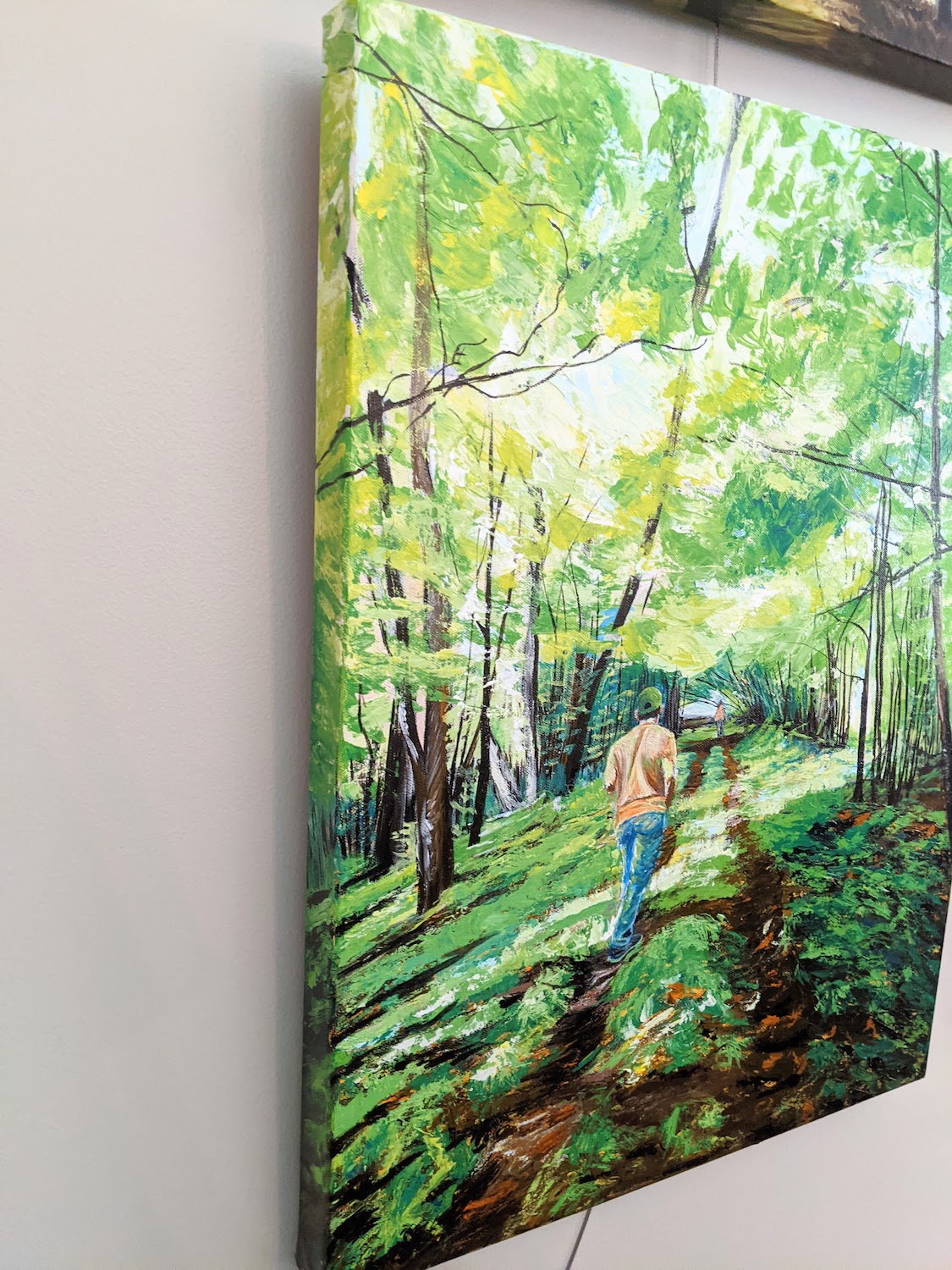 Onward and Upward is an original 18×24 acrylic painting on gallery-wrapped 1.5 inch deep canvas. This piece is inspired by the mysteries and excitement of exploring new places. Finding old forgotten paths to follow, torn between the up-close details and what has yet to be discovered.