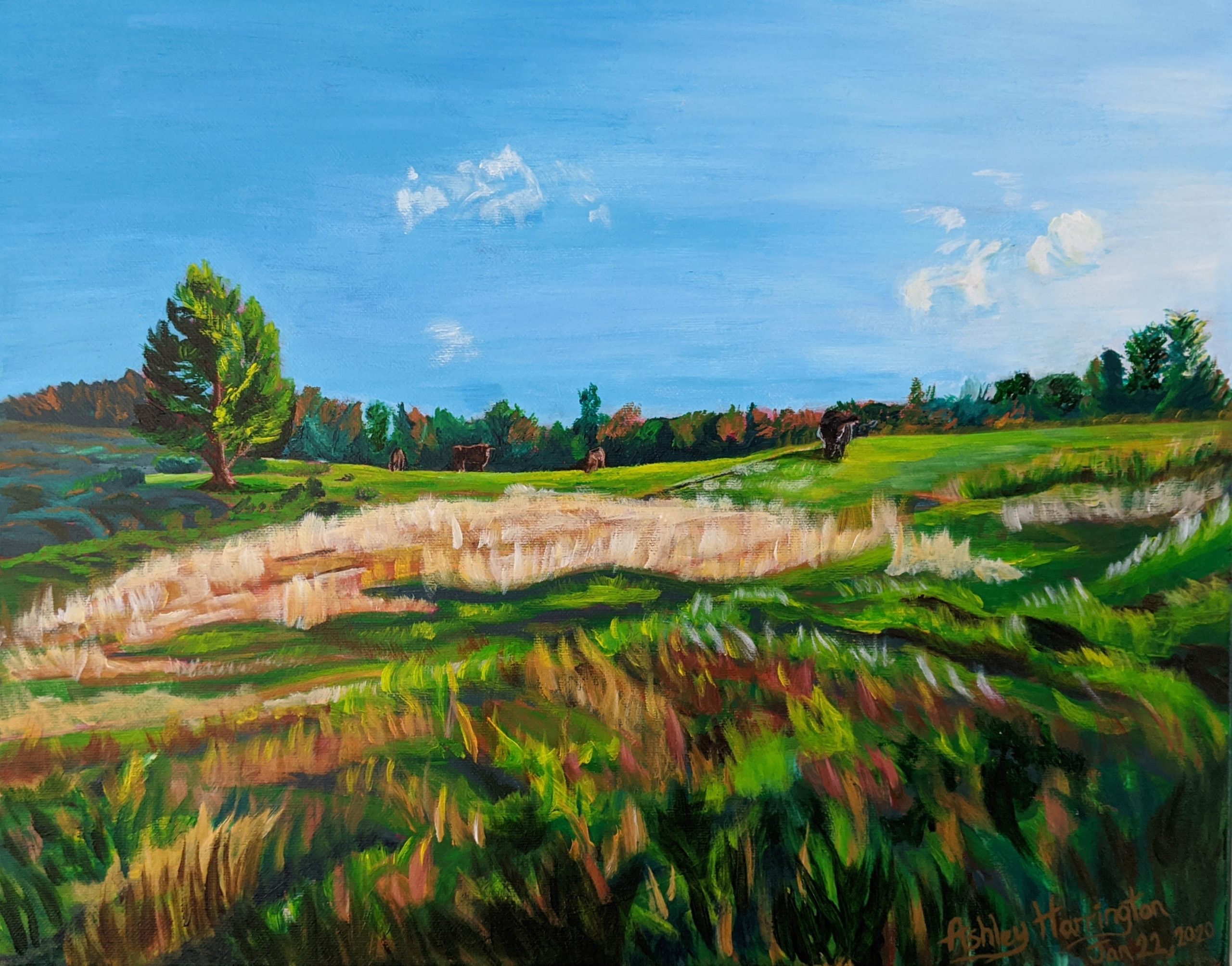 Open Air is an original 20×16 acrylic painting on stretched canvas. Inspired by the abrupt contrast moving from lush forest to a learing of fields. There is more space physically and mentally, you instinctively breath deeper feeling the flow of the breeze along the rolling fields.