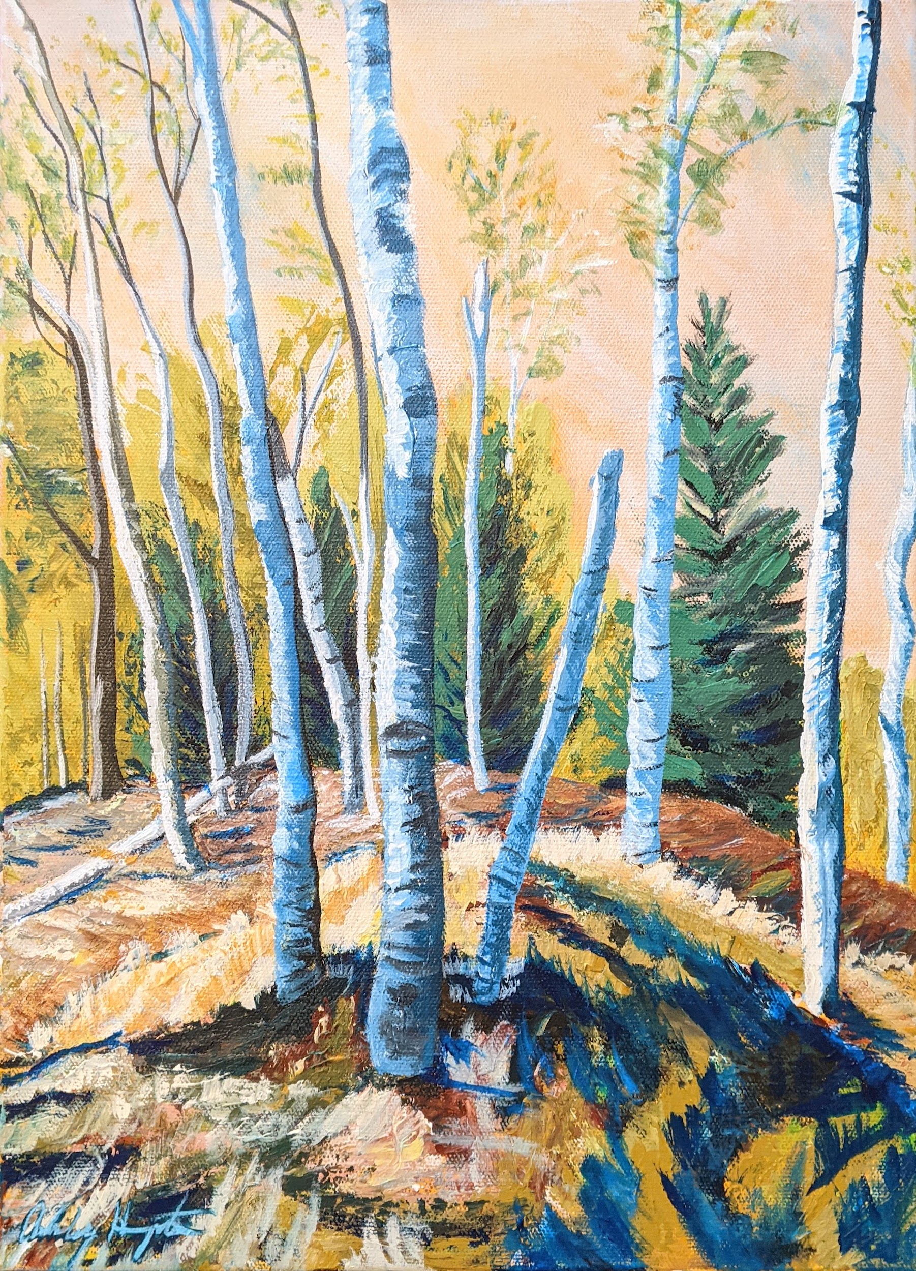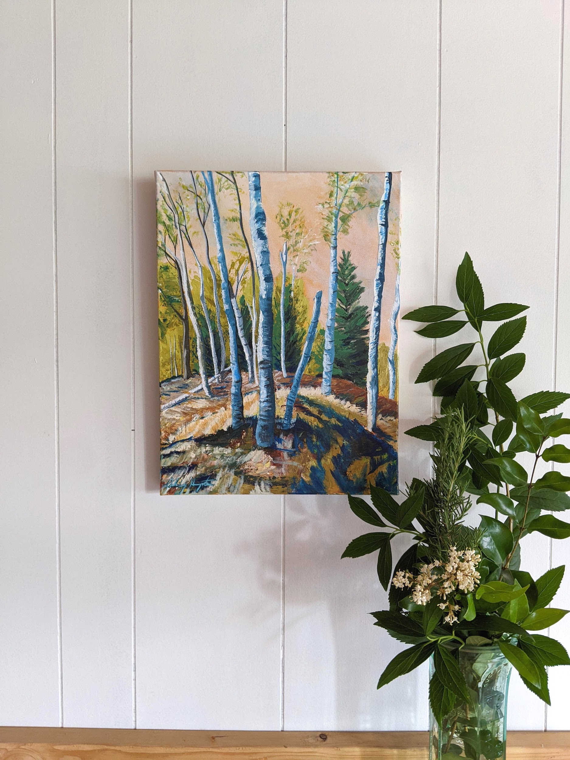 Waiting At The Top is an original 12×16 acrylic painting on gallery-wrapped 1.5 inch deep canvas. A continuaiton of Far Far reaching the top of a small hill that is the high point on a little peninsula. Pausing a moment to take in the different trees and shrubbs speackled throughout the landscape. I